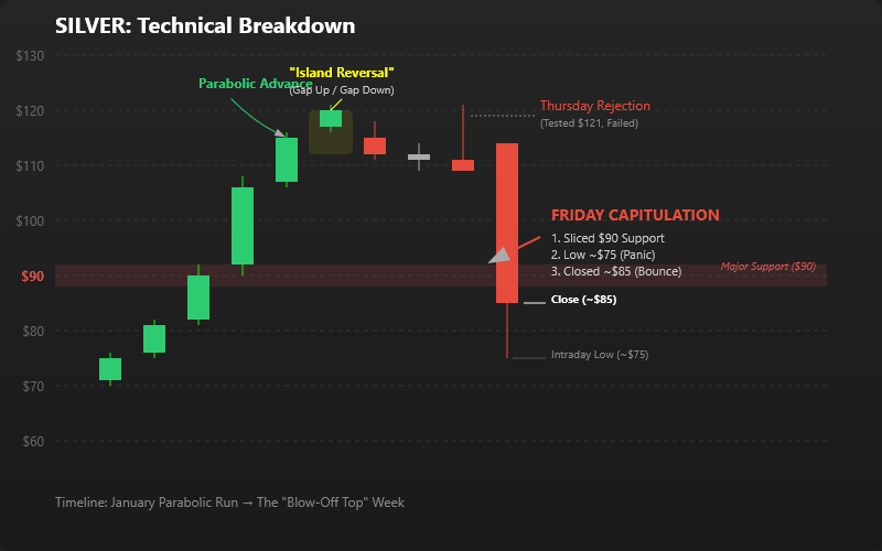 From a technical perspective, silver’s price action this week showed classic signs of a blow-off top followed by a breakdown. After a nearly vertical advance in January, the market’s momentum became unsustainable – parabolic moves have “hair triggers,” as one strategist put it[7]. Indeed, the chart formed an “island reversal” pattern early in the week: Monday’s gap-up to record highs was followed by a gap-down on Tuesday, stranding that peak and signaling bullish exhaustion. By mid-week, silver had notched a long-tailed reversal candle (after touching $121 and then retreating to close near $114 on Thursday), hinting that buyers were losing steam. The final blow came Friday when key support levels snapped – notably the ~$90 zone that had acted as support during earlier pullbacks was sliced right through. The free-fall drove prices as low as the mid-$70s intraday, well below the former breakout point around $80, before a bounce lifted silver back to an ~$85 close. In technical terms, this represents a failed breakout and trend break: the metal gave up several weeks of gains in one session, and the sharp breach of support likely triggered cascades of stop-loss selling and margin calls. On the weekly chart, the result is a huge bearish engulfing candle, an outside-week reversal that suggests the uptrend’s momentum has been broken in the short term. Traders will now be watching whether silver can stabilize above the mid-$80s support region (roughly coinciding with its mid-January consolidation) or if additional downside will test the next support around the low-$70s (the late-2025 congestion area). The speed of the drop itself is telling – it reflects a capitulation-style move often seen at the end of euphoric rallies.
