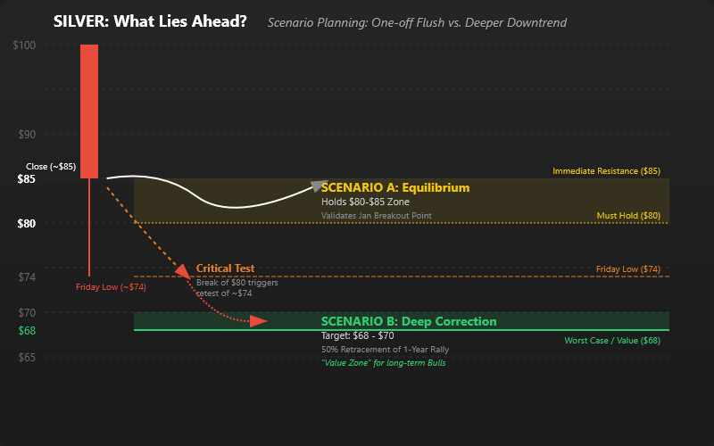 - Technical Support Zones: The first area to watch is the $80–$85 zone, which roughly corresponds to Friday’s closing level and the breakout point of the January rally. Thus far, silver has managed to hold above ~$80, a level that previously acted as resistance and could now serve as initial support. If this zone holds in the coming days with some basing price action, it would suggest the market found an equilibrium after the panic. A stronger support lies around the mid-$70s (Friday’s intraday low was about $74). Below that, the next major reference would be around $68–$70, which one prominent analyst flagged as a potential worst-case downside target if another 15–20% slide unfolds[23][24]. Notably, $68 would represent a 50% retracement of the entire one-year rally – a level some longer-term bulls might see as a value zone if reached.