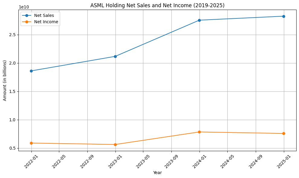 ASML has delivered strong growth and solid financial metrics over the last five years. Revenue expanded from €11.8 billion in 2019 to €27.6 billion in 2023[1][2], a compounded annual growth rate of roughly 23%. This growth was not linear – sales jumped notably in 2021 (+33% YoY) and 2023 (+30% YoY) amid surging demand for semiconductor equipment[5][1]. Even 2022, a year of industry cyclicality, saw record sales of ~€21.2 billion (up ~14% YoY)[6]. On the earnings side, net income grew from €2.6 billion in 2019 to approximately €7.6 billion in 2023, with net profit margins improving to the high-20s%[7][4]. For example, 2021 benefited from higher operating leverage – net income reached €5.9 billion (≈32% net margin)[8] – while 2022 margins dipped slightly before rebounding in 2023 as profitability improved again[9][4].