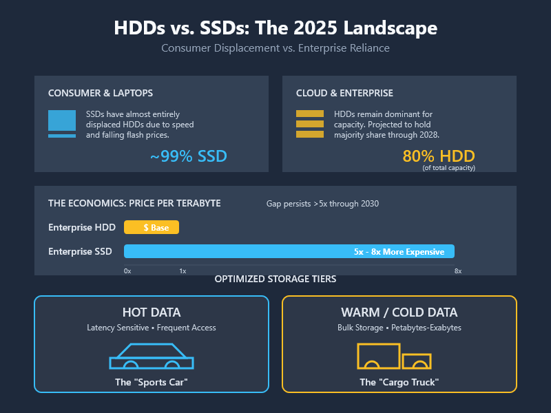 HDDs vs. SSDs (2025–2026): The balance between HDDs and SSDs is a pivotal industry topic. In consumer devices and laptops, SSDs have almost entirely displaced HDDs by 2025 due to speed and falling flash prices[29]. But in enterprise and cloud storage, the picture is more nuanced. Hard disks remain the dominant medium for “cold” data storage – estimates say HDDs will still make up nearly 80% of storage capacity in cloud data centers through 2028[30]. The reason is simple: cost at scale. While SSD prices have dropped, enterprise SSDs still cost 5–8× more per terabyte than enterprise HDDs[31], and that cost gap is projected to persist (remaining >5× through the next five years). For storing petabytes-exabytes of data that isn’t frequently accessed, HDDs offer dramatically lower Total Cost of Ownership (TCO). Large cloud customers actually optimize their storage tiers by use case – using expensive flash only for hot, latency-sensitive data, and HDDs for the vast warm and cold data that doesn’t need instant access[32][33]. This tiered approach is akin to using a fleet of trucks (HDDs) to haul bulk cargo, versus sports cars (SSDs) for quick deliveries – each has a place based on economics and performance[34][33].