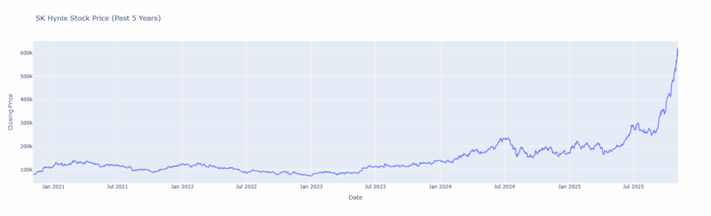 - 2024–2025 Surge to New Highs: In 2024 and into 2025, SK hynix’s rally accelerated further. The stock not only regained pre-2022 levels but hit record highs by 2025[23]. Year-to-date 2025, SK hynix shares had skyrocketed (up nearly +277% by November 2025, according to market data[24]). This dramatic climb was fueled by euphoric investor sentiment around AI: Nvidia’s blockbuster growth in 2023–2024 underscored the value of AI-related suppliers like SK hynix. In mid-2025, SK hynix’s market capitalization reached ₩213 trillion (~$157 billion)[25], making it the second-most valuable company in Korea after Samsung. News of record quarterly earnings (e.g. a >₩11 trillion operating profit in Q3 2025) and sold-out order books for next-generation memory reinforced the bull case. By late 2025, SK hynix’s stock was trading at its highest level since the dot-com era[26].