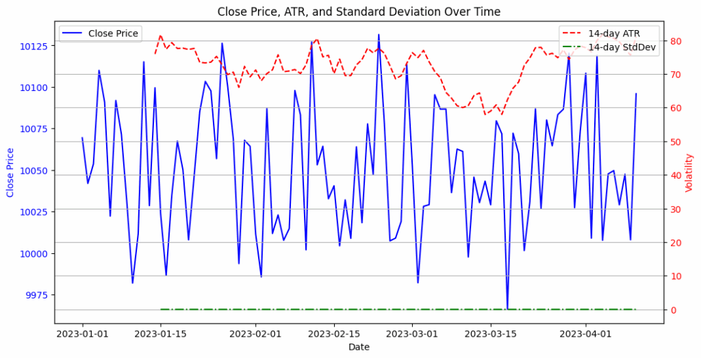 In the above snippet (which is hypothetical data for illustration), on March 1, the closing price is 95.61, the 14-day ATR is ~1.13, and the 14-day standard deviation of returns is ~0.0147 (i.e., 1.47% daily). We can also plot these to visualize how ATR and standard deviation behave over time: